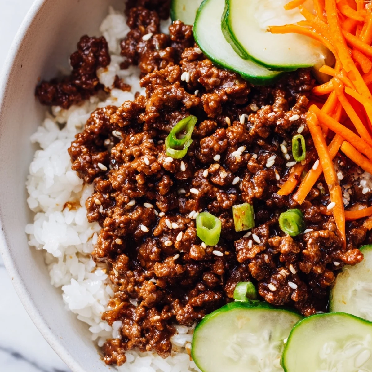 This vibrant bowl brings together savory ground beef infused with soy, ginger, and gochujang for that authentic Korean flavor. The sweet and spicy sauce perfectly coats the meat while creating a glossy finish that clings to every grain of steamed rice. Fresh julienned carrots, crisp cucumber, and scallions add crunch and brightness, balancing the rich beef. Toasted sesame seeds bring nutty depth, while optional kimchi offers probiotic tang. The entire dish comes together in under 30 minutes, making it ideal for busy evenings when you want something satisfying without hours of preparation.