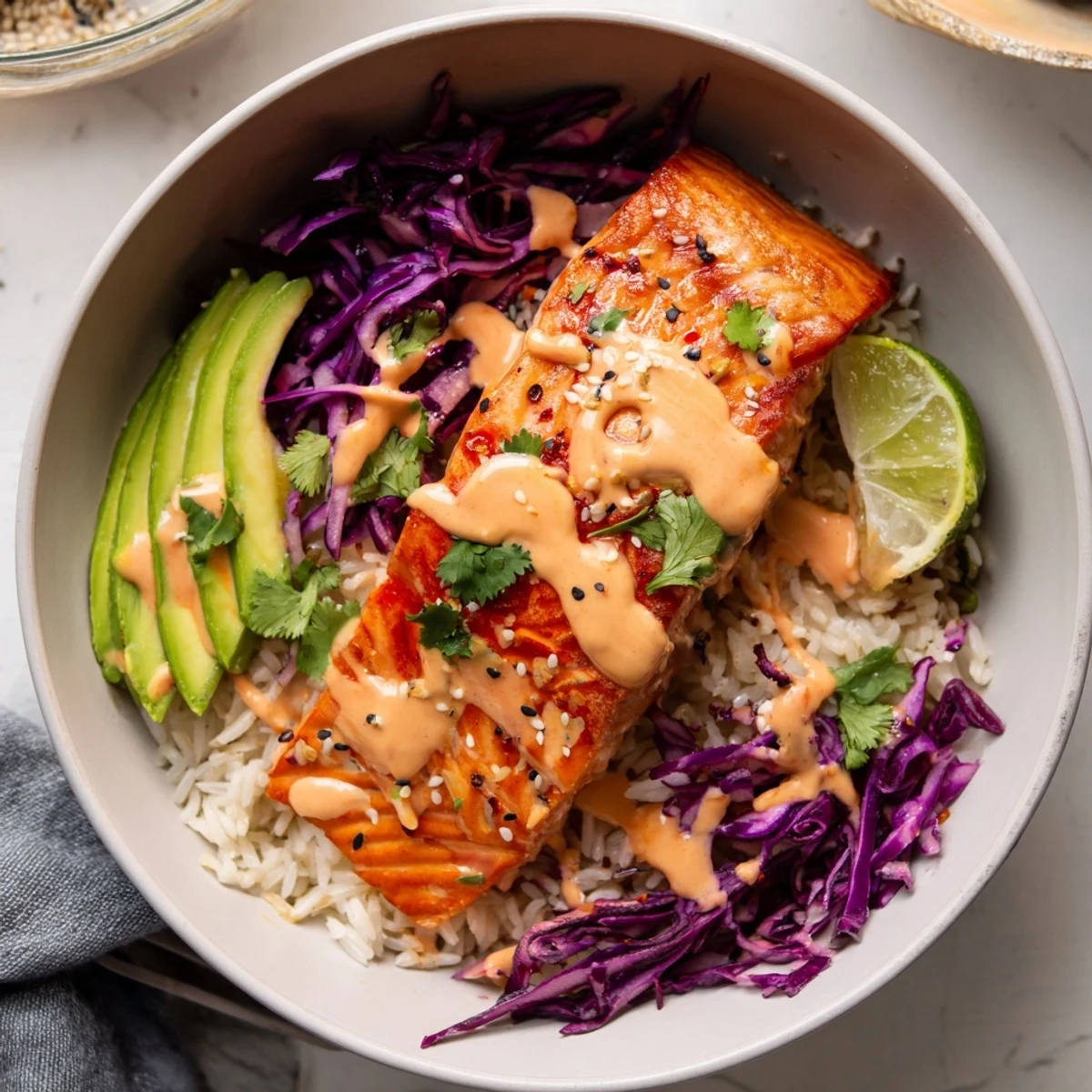 Roast seasoned salmon at 400°F until just opaque and flaky, about 12–15 minutes. While it cooks, whisk mayonnaise, sweet chili sauce, sriracha, honey and lime into a smooth, creamy Bang Bang sauce. Divide warm jasmine rice among bowls, arrange shredded cabbage, carrots, avocado and scallions, then top with the salmon. Finish with sesame seeds, cilantro and lime wedges. Swap Greek yogurt for mayo to lighten or add edamame and cucumber for extra crunch.