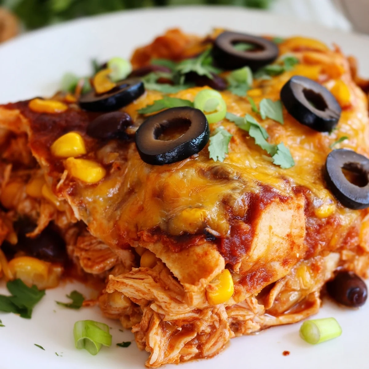 This comforting Tex-Mex bake brings together tender shredded chicken, black beans, sweet corn, and aromatic spices layered between soft tortillas. Each bite delivers gooey melted cheese and savory enchilada sauce for ultimate satisfaction.