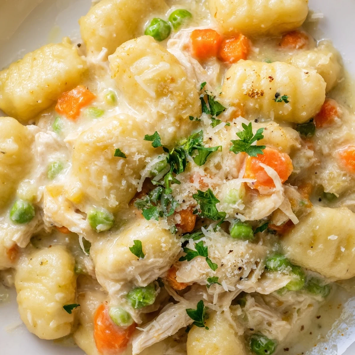 This satisfying one-pot dinner brings together tender shredded chicken, soft potato gnocchi, and classic pot pie vegetables in a rich, creamy sauce. The dish comes together in just 45 minutes with only 15 minutes of prep time, making it perfect for busy weeknights.