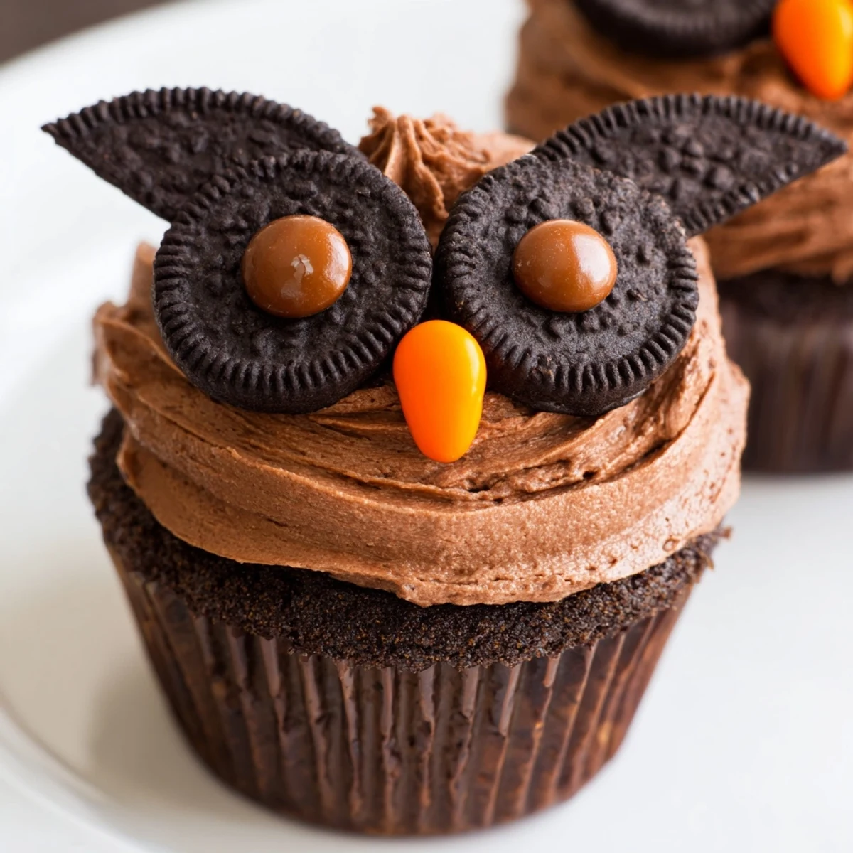 These delightful chocolate cupcakes bring whimsical charm to any gathering with their playful owl design. Start with moist, tender chocolate sponge made with rich cocoa powder, then top each one with silky chocolate buttercream frosting. The magic happens during decoration—carefully split Oreo cookies to reveal the cream filling, creating perfect owl eyes, then add brown candy pupils and bright orange or yellow beaks. The entire process takes just under 40 minutes from start to finish, making these surprisingly achievable for bakers of any skill level. Kids and adults alike will be captivated by the charming expressions you can create—each owl can have its own personality through slight variations in candy placement. These make fantastic additions to birthday parties, school events, or autumn gatherings when owl themes are especially popular.